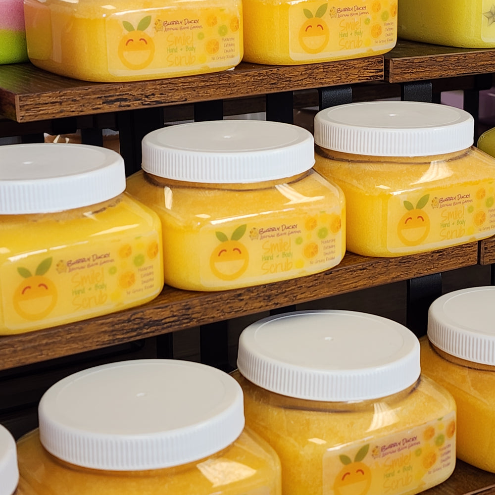 Make your skin smile with our "Smile!" Exfoliating Hand & Body Scrub! Our energizing, citrus-scented scrub emulsifies into a creamy lotion when wet, leaving no greasy residue. Packed with shea butter, mango butter, cocoa butter, and avocado oil, it'll leave your skin feeling smooth, moisturized, and radiant. (Seriously, you'll be grinning from ear to ear.)