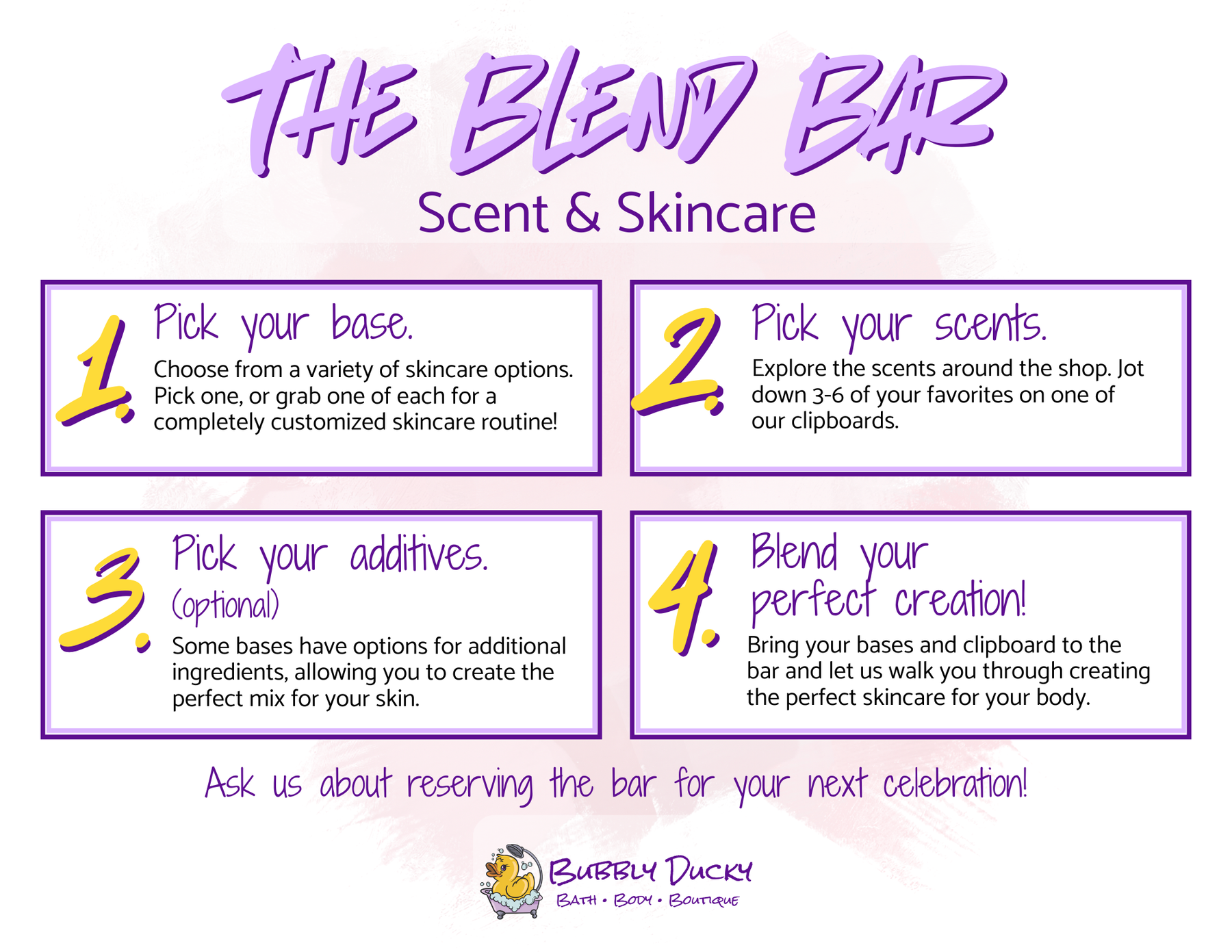 The Blend Bar: Scent & Skincare is a guided, made-for-you experience inside Bubbly Ducky where you blend your own personal fragrance and use it to create custom bath and body products.