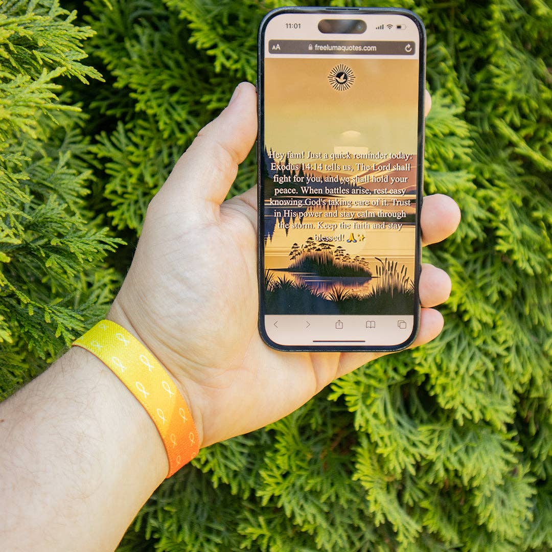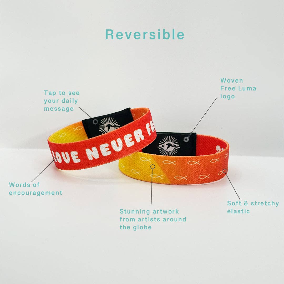 Carry the unwavering love of God with our "God's Love Never Fails" bracelet. This piece offers comfort and assurance. Designed to be a gentle reminder of God's love. Simply place your smartphone on the Free Luma logo to pop up your daily Christian inspired message based on a new Bible verse each day. • 100% waterproof • Tap your phone to the bracelet to load your daily message