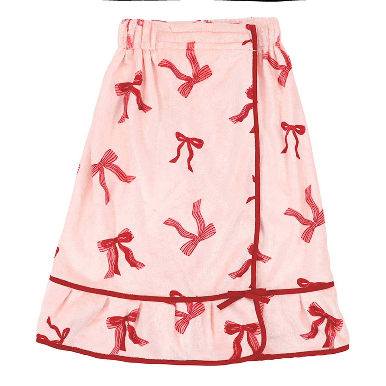 The secure elastic back and adjustable Velcro front closure ensure a comfortable fit that stays in place—no slipping, no readjusting. Finished with a sweet bow print and feminine ruffle hem, this spa wrap blends practicality with charming style.