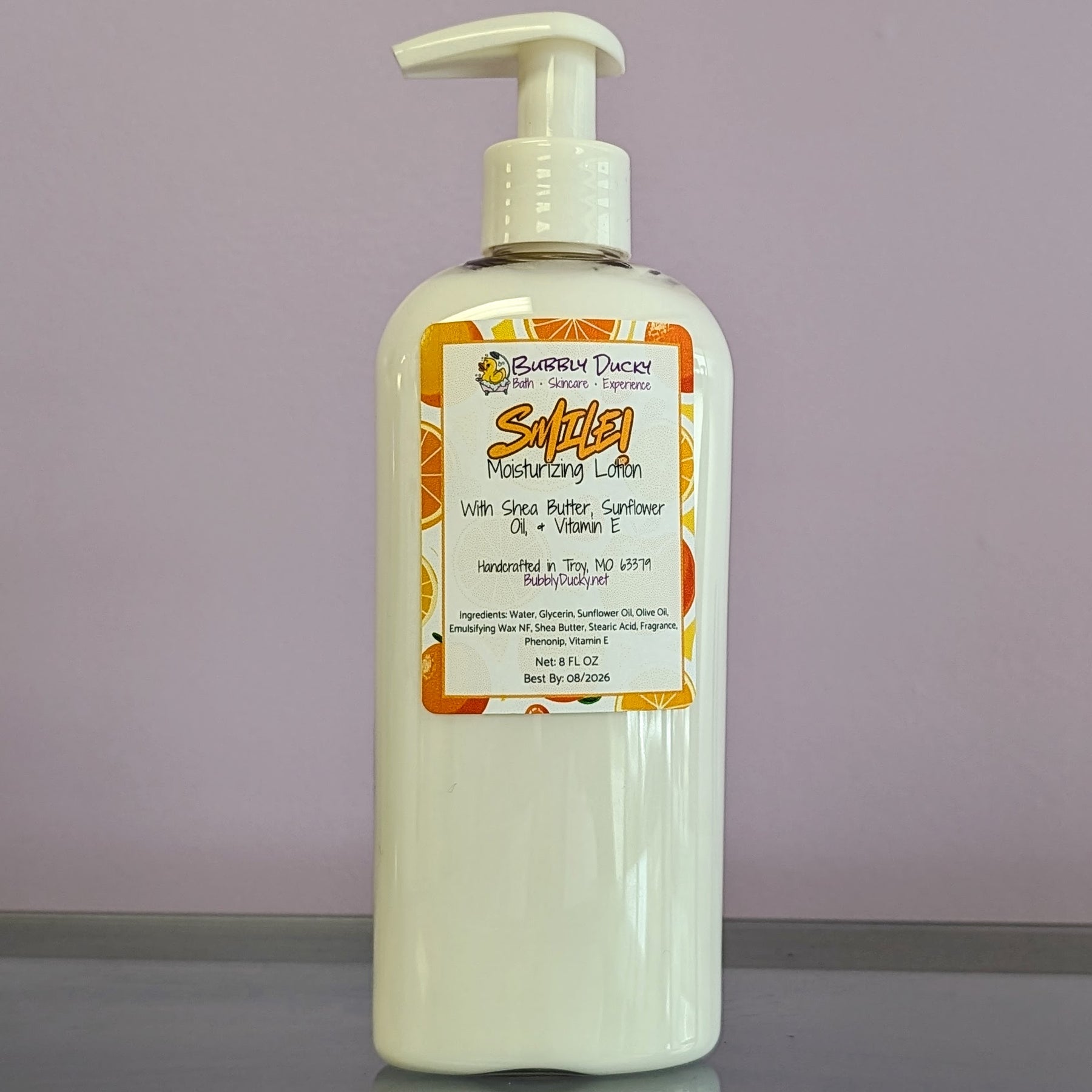 Say goodbye to dry, dull skin and hello to hydrated, happy skin with "Smile" Moisturizing Lotion. Infused with shea butter, sunflower oil, and vitamin e, this concentrated formula locks in moisture and leaves a refreshing, citrus scent. Bid adieu to dryness and hello to a soft, smooth complexion all day long.